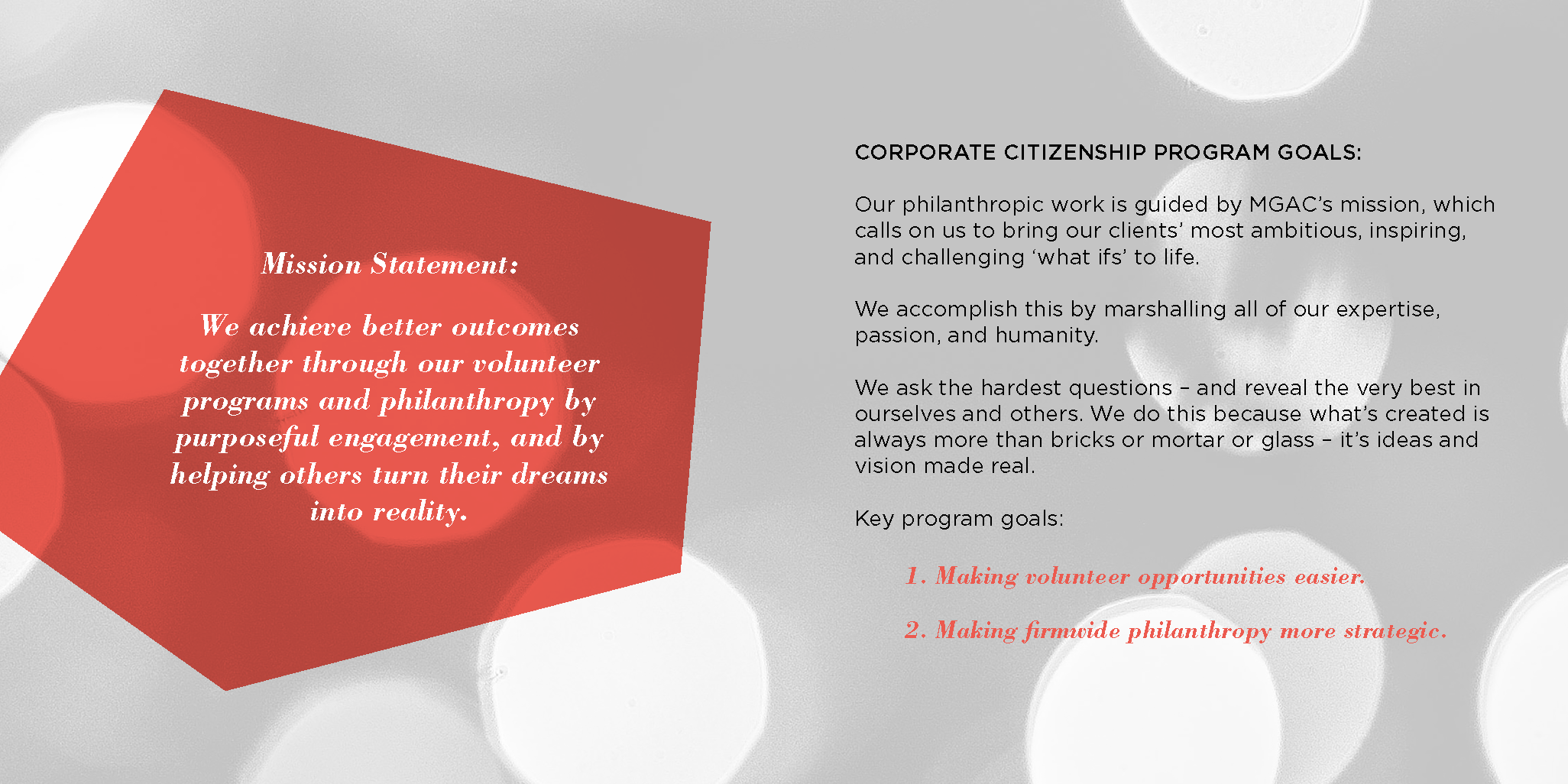 Overview: Formalize corporate citizenship program by developing connections with organizations and nonprofits in need and finding meaningful and on-going ways to partner. Define and expand corporate volunteering and contributions to make a lasting impact in the community.